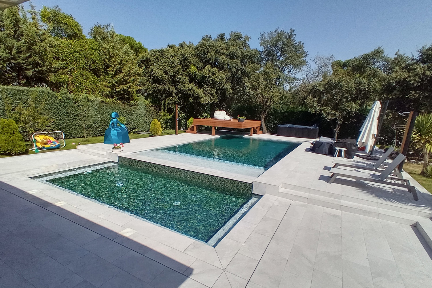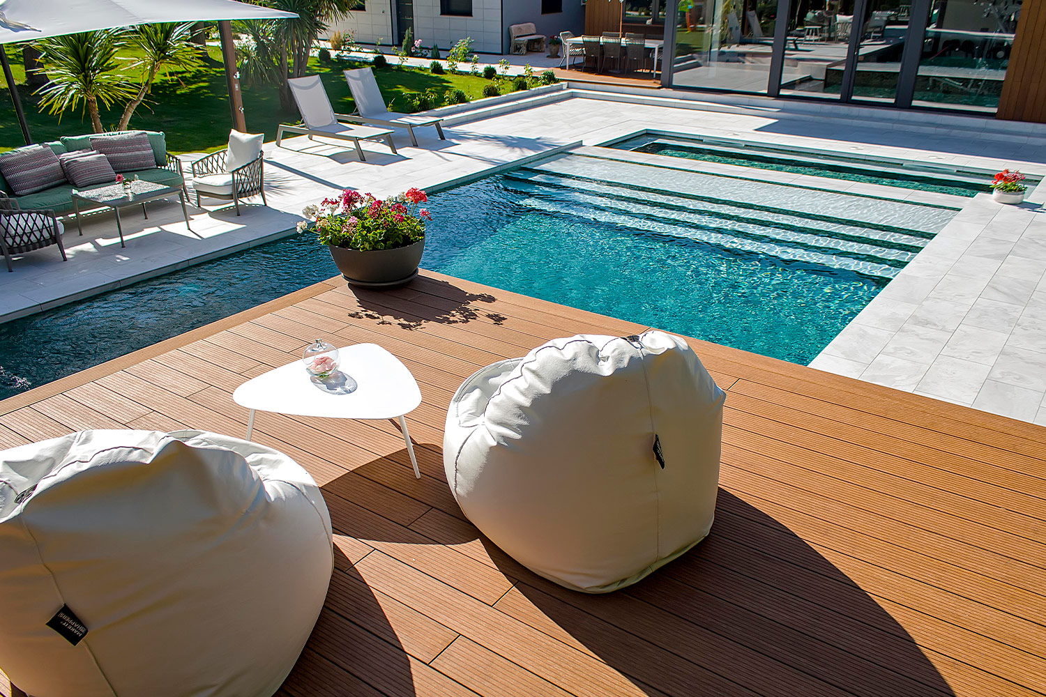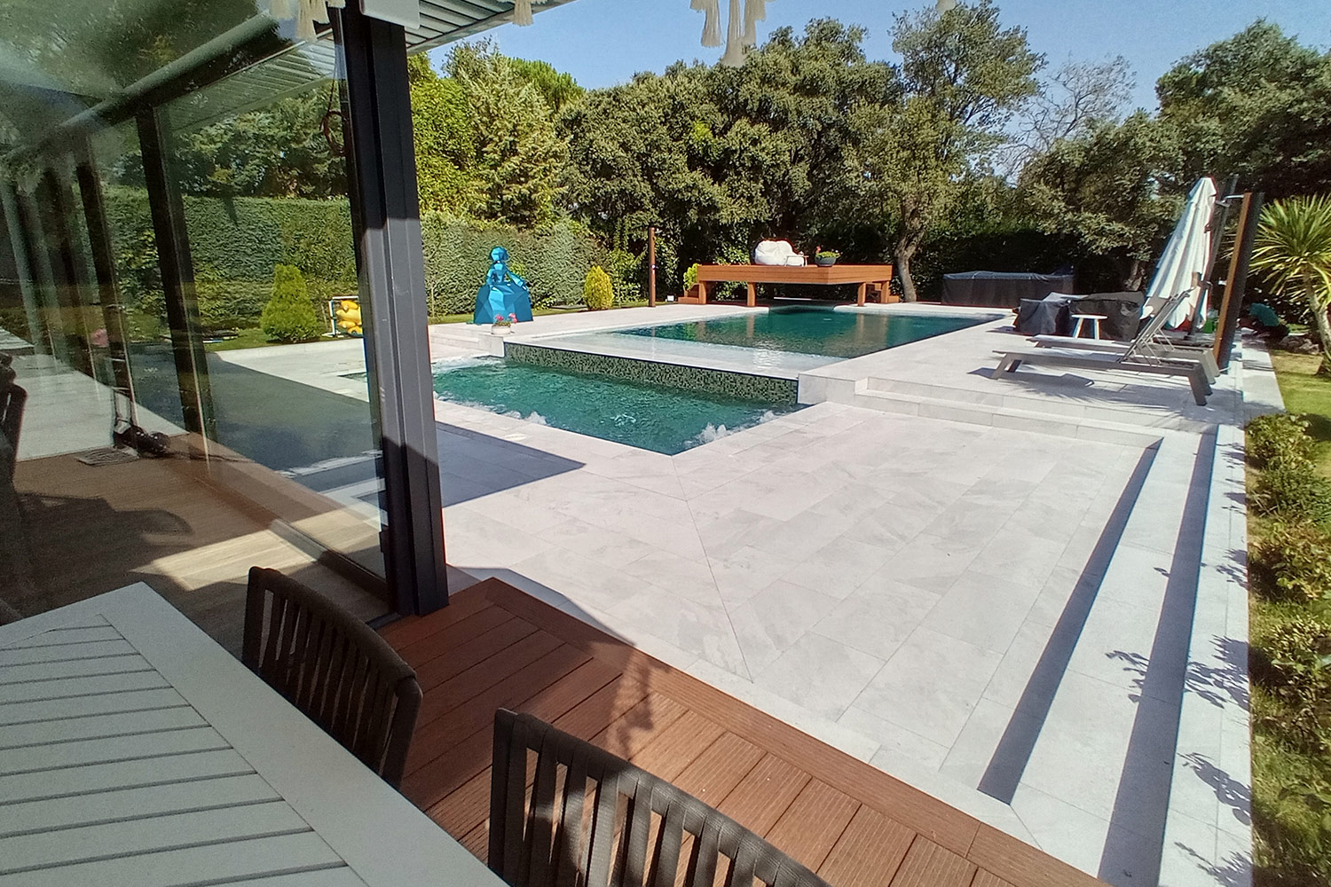 Μια εκπληκτική βεράντα από την Aquazzaro Swimming Pools εντελώς στην Cupira Hueso με το σχήμα 37.5x75cm. Ξεδιπλώνεται σε τρία διαφορετικά ύψη, με το τελευταίο να σχηματίζεται από μια υπερυψωμένη πλατφόρμα, με αυτόν τον τρόπο, μαζί με το μπλε της πισίνας, η αντίθεση με το πεζοδρόμιο είναι τέλεια, κάνοντας το ανοιχτό χρώμα της να ξεχωρίζει ακόμα περισσότερο.