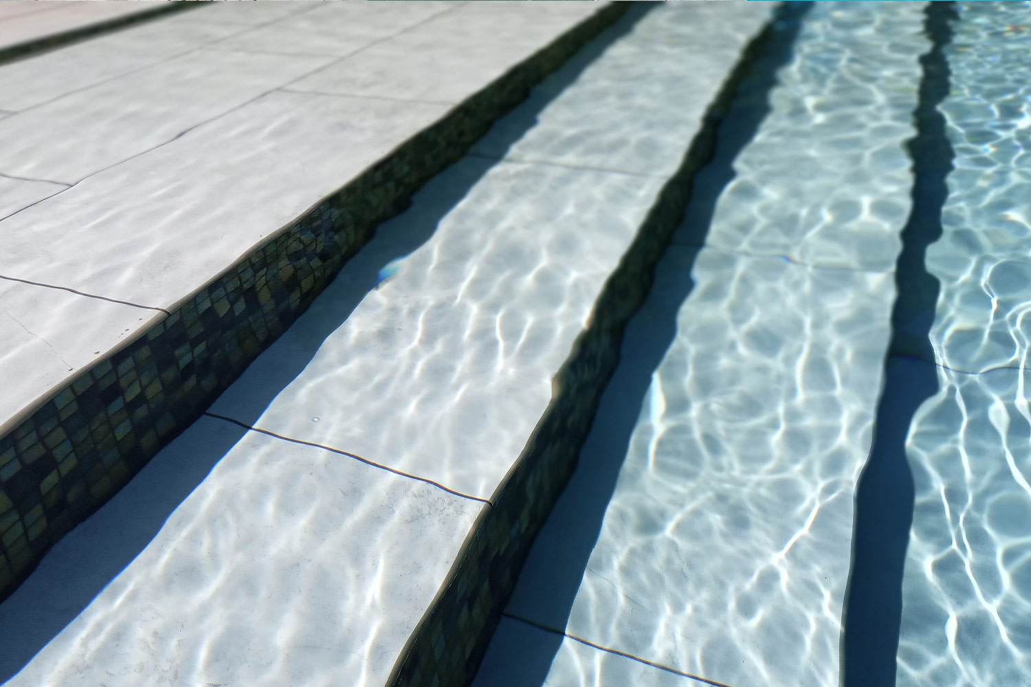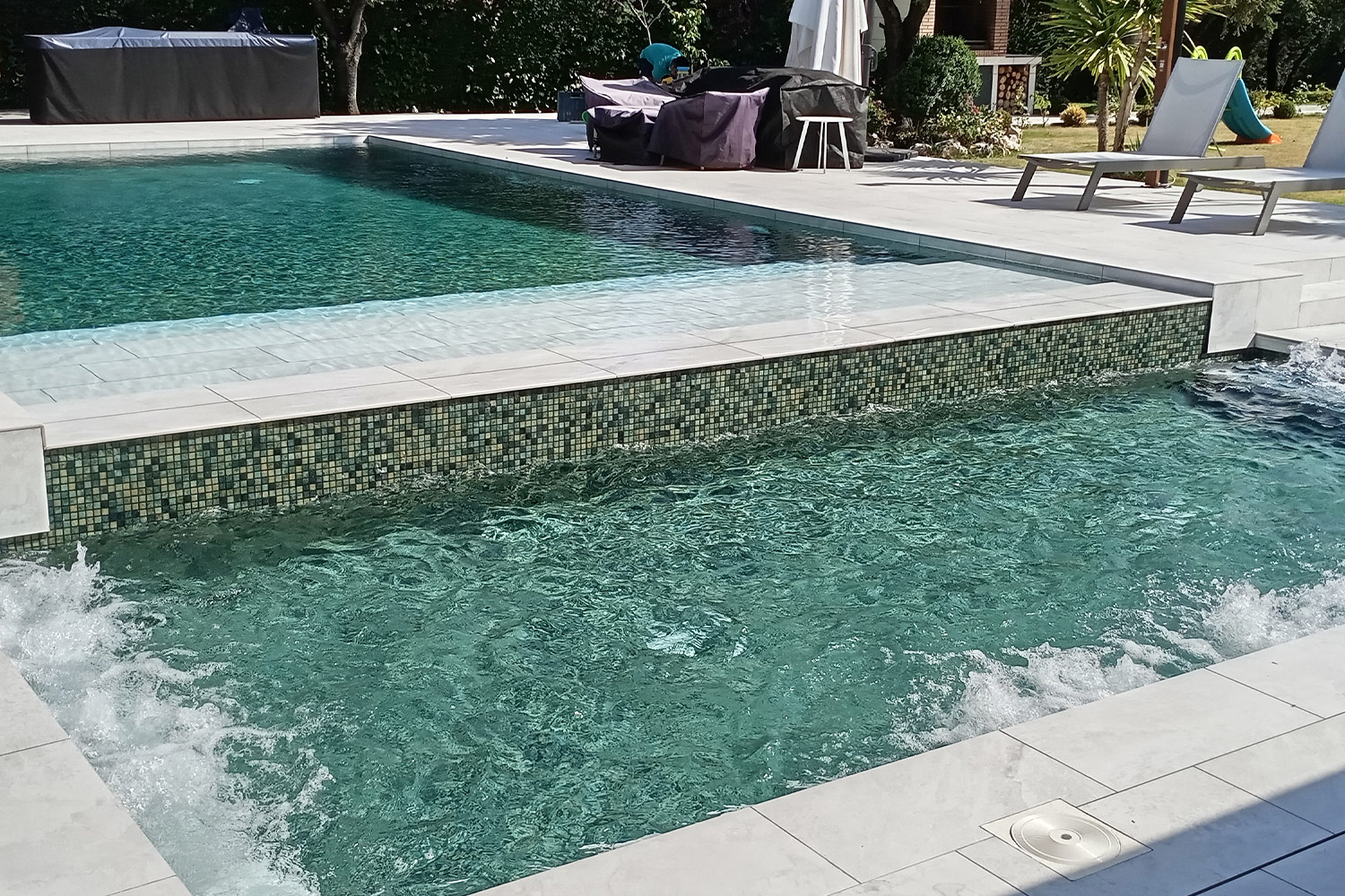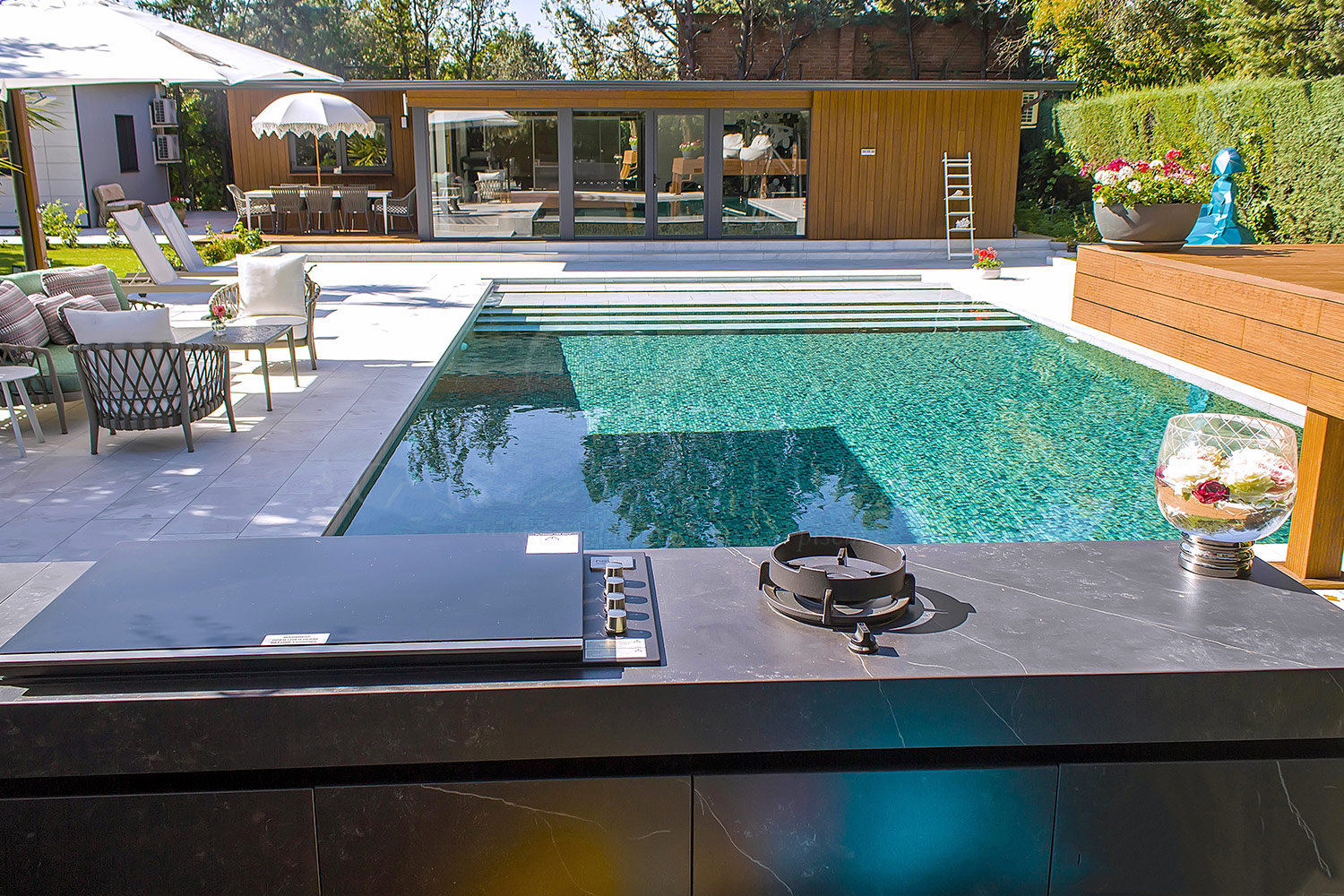 Μια εκπληκτική βεράντα από την Aquazzaro Swimming Pools εντελώς στην Cupira Hueso με το σχήμα 37.5x75cm. Ξεδιπλώνεται σε τρία διαφορετικά ύψη, με το τελευταίο να σχηματίζεται από μια υπερυψωμένη πλατφόρμα, με αυτόν τον τρόπο, μαζί με το μπλε της πισίνας, η αντίθεση με το πεζοδρόμιο είναι τέλεια, κάνοντας το ανοιχτό χρώμα της να ξεχωρίζει ακόμα περισσότερο.