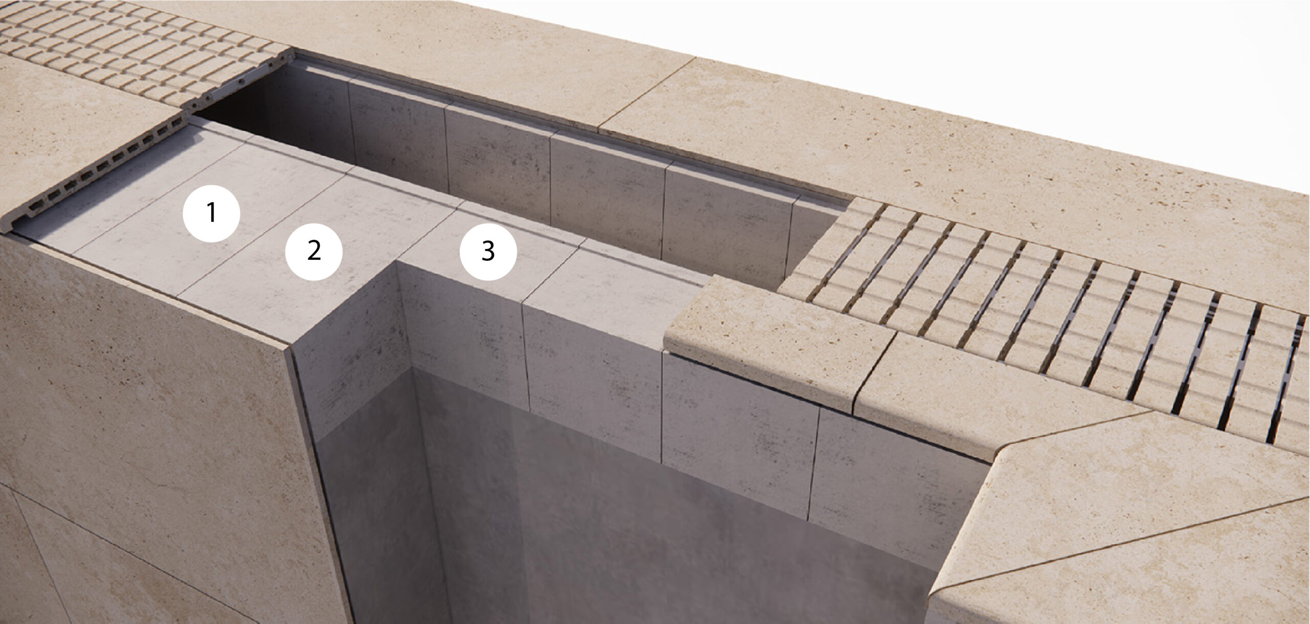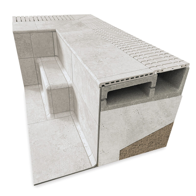 Ο πιο απλός τρόπος για την κατασκευή του υπερχείλισης καναλιού αποστράγγισης για πισίνες, χωρίς να απαιτείται χειροκίνητη κατασκευή στο εργοτάξιο. Ένα κατασκευαστικό σύστημα από τσιμεντόλιθους που επιτρέπει ακριβή ευθυγράμμιση και ενσωματώνει το περιμετρικό χείλος της πισίνας και την κεραμική σχάρα πισίνας