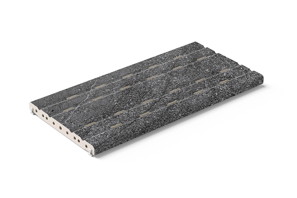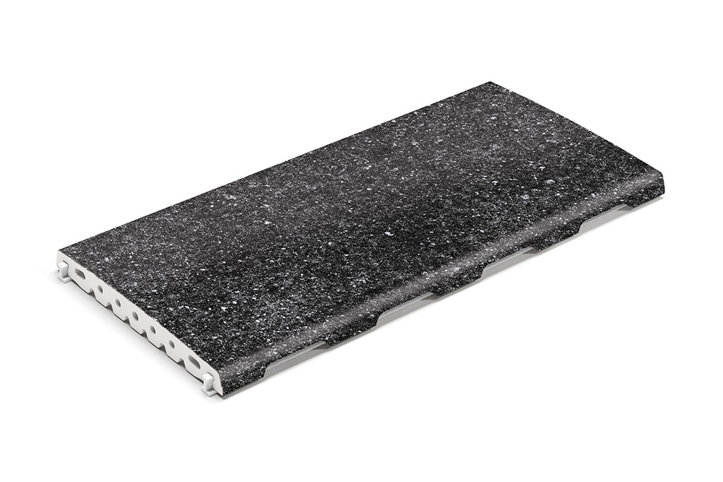 Volcanic is inspired by the origin of basalt stone, a rock born from the rapid solidification of volcanic lava. A stone with a characteristic dark appearance, with shades ranging from dark grey to the deepest black. It has mottled backgrounds, and a very distinctive porous texture. A look that has been recreated with extensive and environmentally friendly techniques. With all these features the ensemble creates an atmosphere of elegance and versatility.