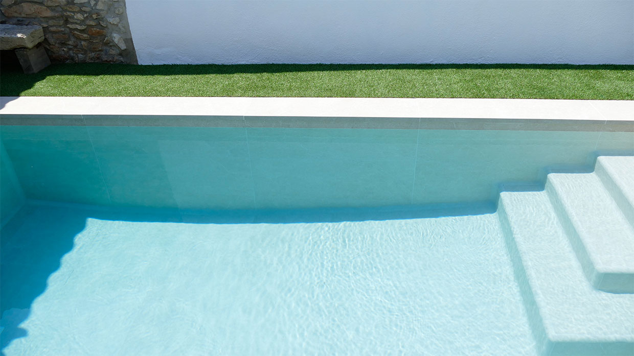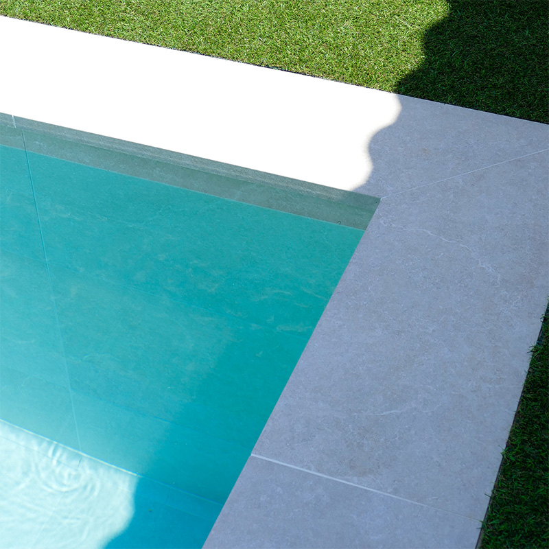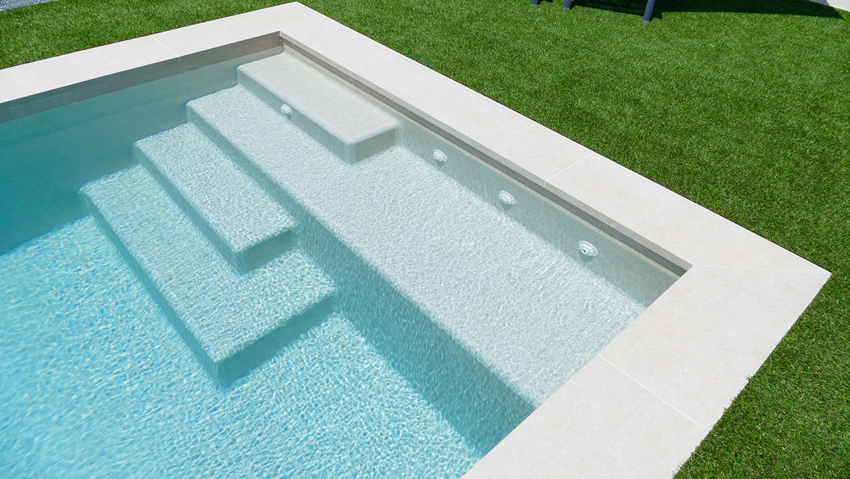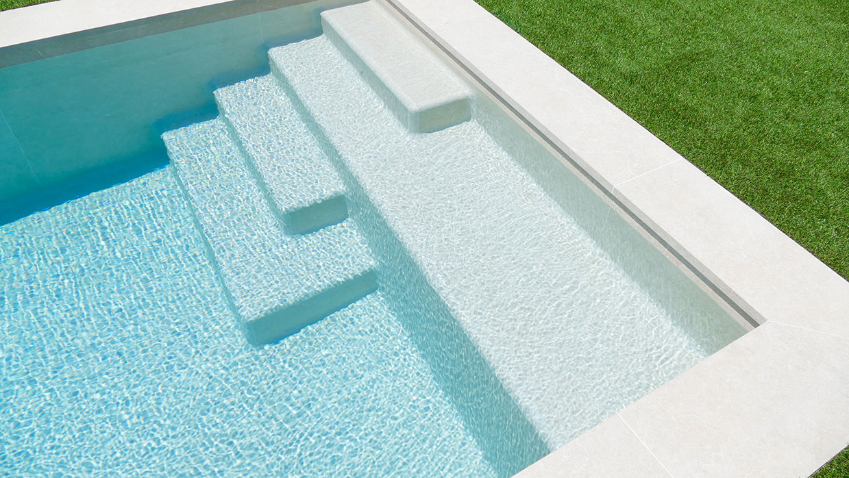 The project includes ceramic steps and half-round terminations, ensuring clean transitions between surfaces while reinforcing safety and visual continuity throughout the pool.