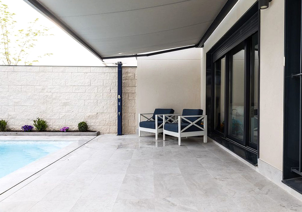 Laying a light-coloured floor for the terrace will promote the feeling of spaciousness in this area. In this project, Piscinas CI has used the large 60 x 120 cm format of our Cupira Hueso porcelain tile. With a design inspired by natural irregular slate in light tones that create the effect of spaciousness and luminosity that this cosy terrace needed, as it is completely enveloped by walls that create shade in the area.