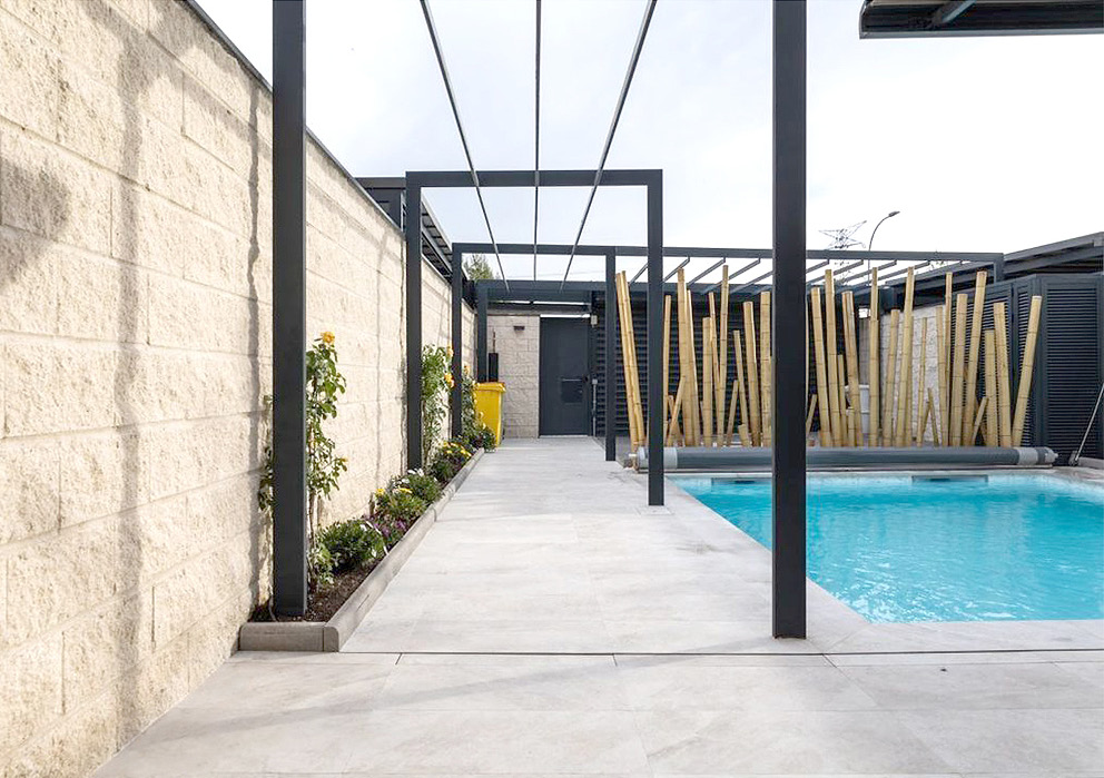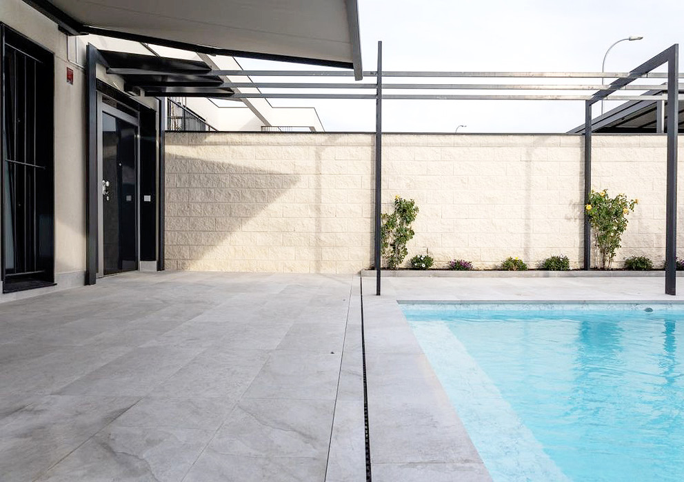 The entire terrace has been clad in this colour, including the crown of the skimmer pool where our straight 33×120 cm steps have been chosen. A technical, aesthetic and modern solution.