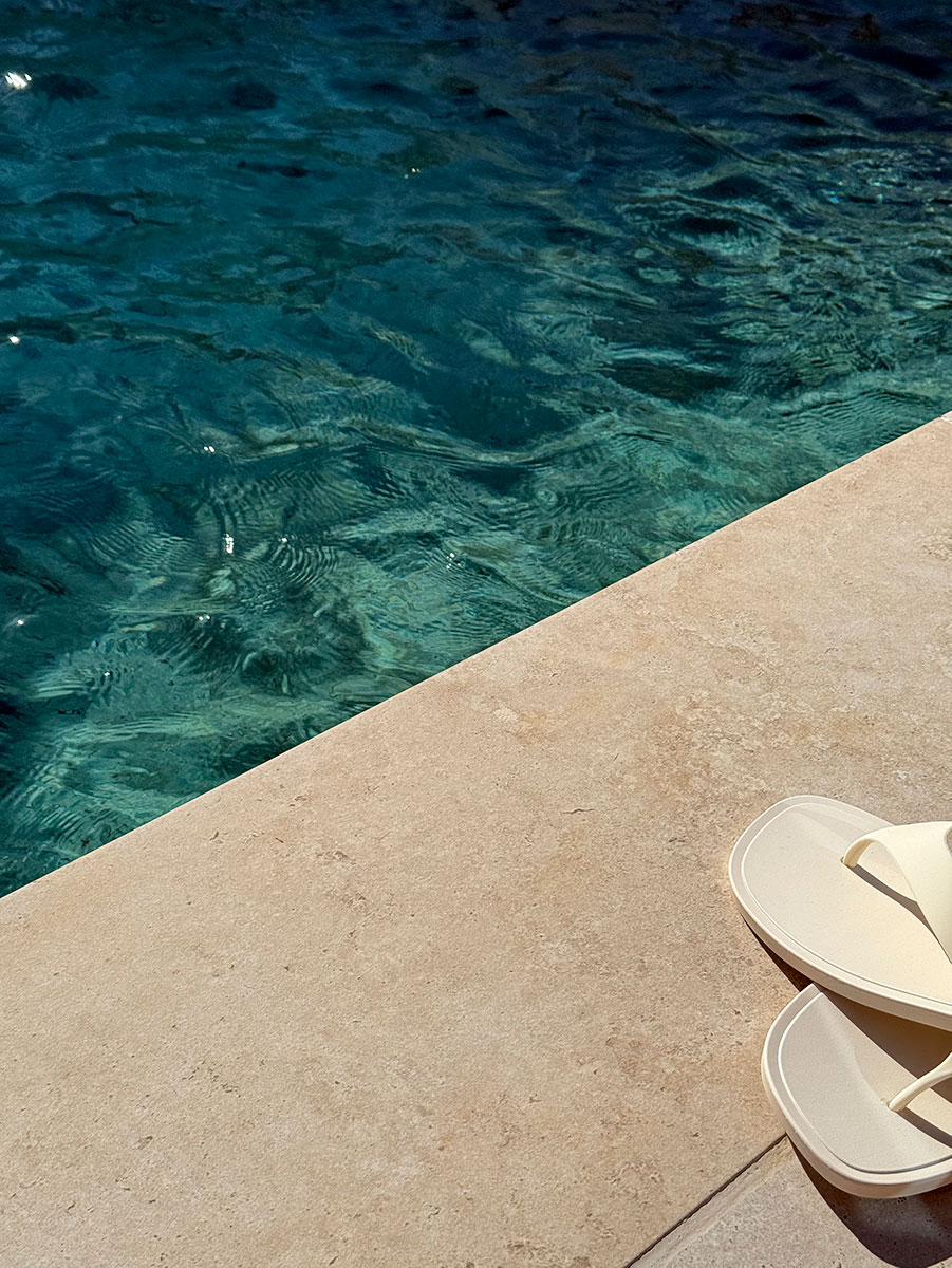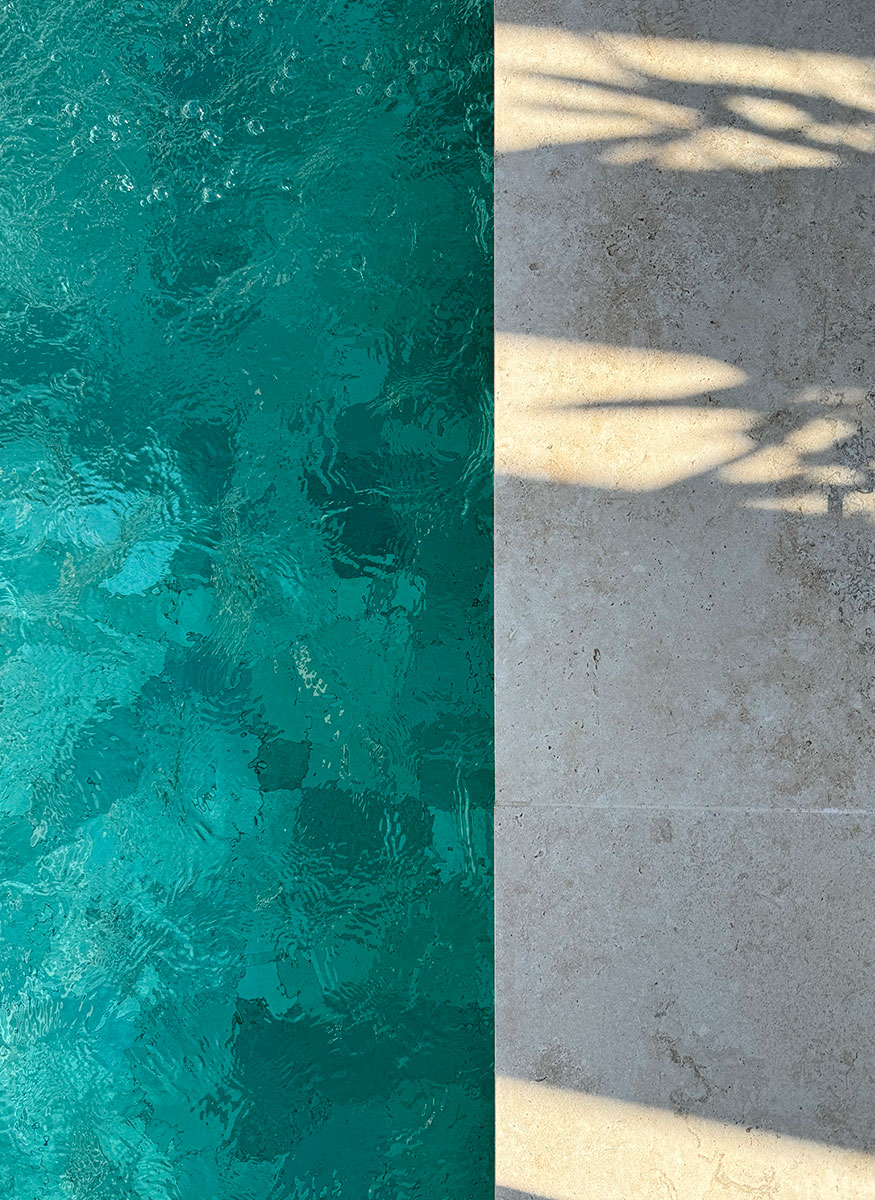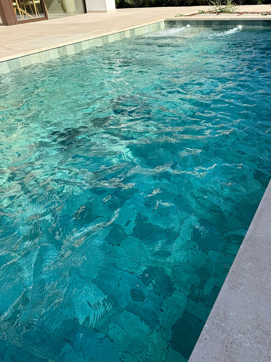 En el interior de la piscina y su coronación, la colección Bali Zatu transforma el agua en un espectáculo visual único. Su tonalidad cálida y natural, inspirada en las piedras de Bali, realza la luminosidad del agua y genera un efecto envolvente que invita al relax.