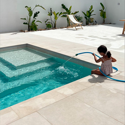 El mismo acabado se ha aplicado tanto en la terraza como en la zona de piscina, incluyendo nuestros peldaños cerámicos especialmente diseñados para garantizar seguridad y continuidad visual. El resultado es un conjunto armónico y duradero que conecta todas las zonas exteriores con una estética uniforme y elegante.