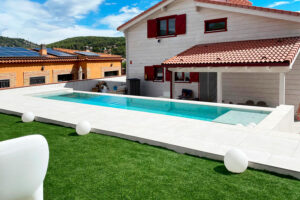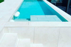 Этот бассейн от Obrambient создан для ценителей белого цвета. Наша плита с имитацией цемента Snow используется для облицовки внутренней части, “пляжа”, лестницы, копинга и террасы, создавая полностью интегрированный проект в одном светлом цвете, который придает этому переливному бассейну еще больше яркости.