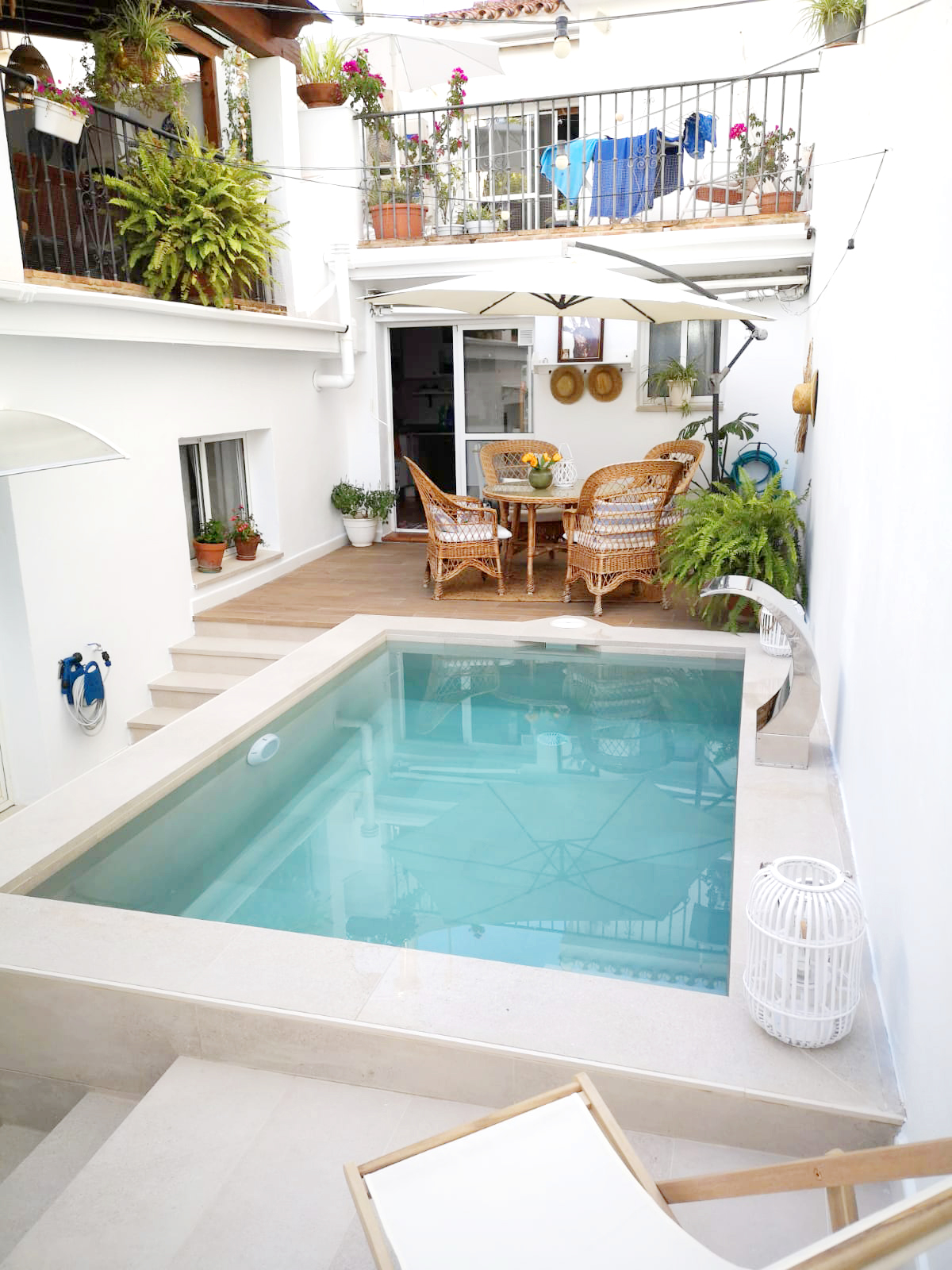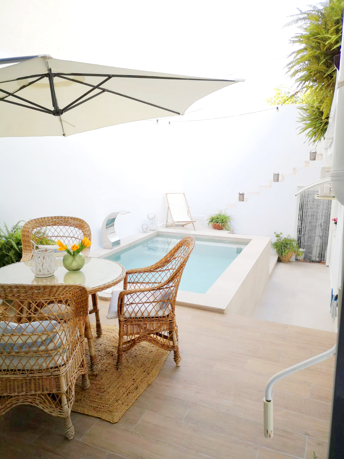 Благодаря его светлым оттенкам и универсальности прямых ступеней для лестниц и копинга бассейна, смогли вместить много элементов в небольшом пространстве, при этом сохраняя чистый и просторный визуальный эффект.